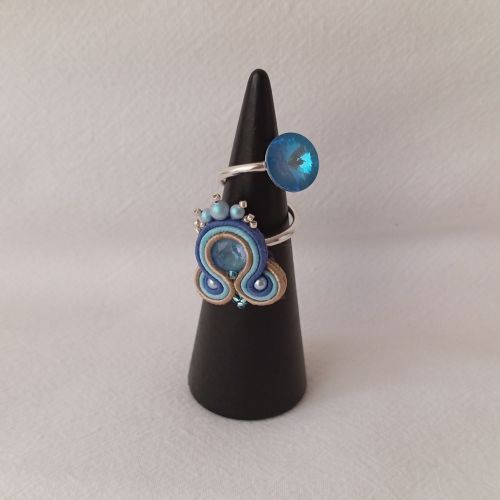 El anillo Marina tiene la base de plata, con un brazo interior adaptable de 16.5mm. Consta de dos cristales, uno solitario, talla rívoli, de 12mm de diámetro y el que va con el aplique es un cristal talla chaton de 8mm de diámetro.
