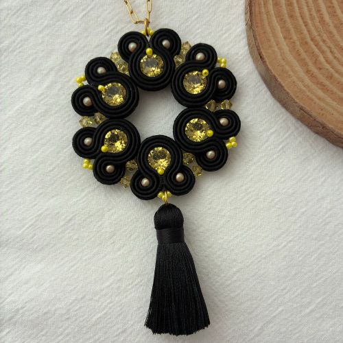 El colgante Fiamma consta de 6 cristales austriacos talla chatón de 8mm de diámetro formando entre ellos un círculo. Adornado con una borla en color negro. La base del colgante es de acero inoxidable dorado. Al ponerlo, queda aproximadamente a la altura del pecho.