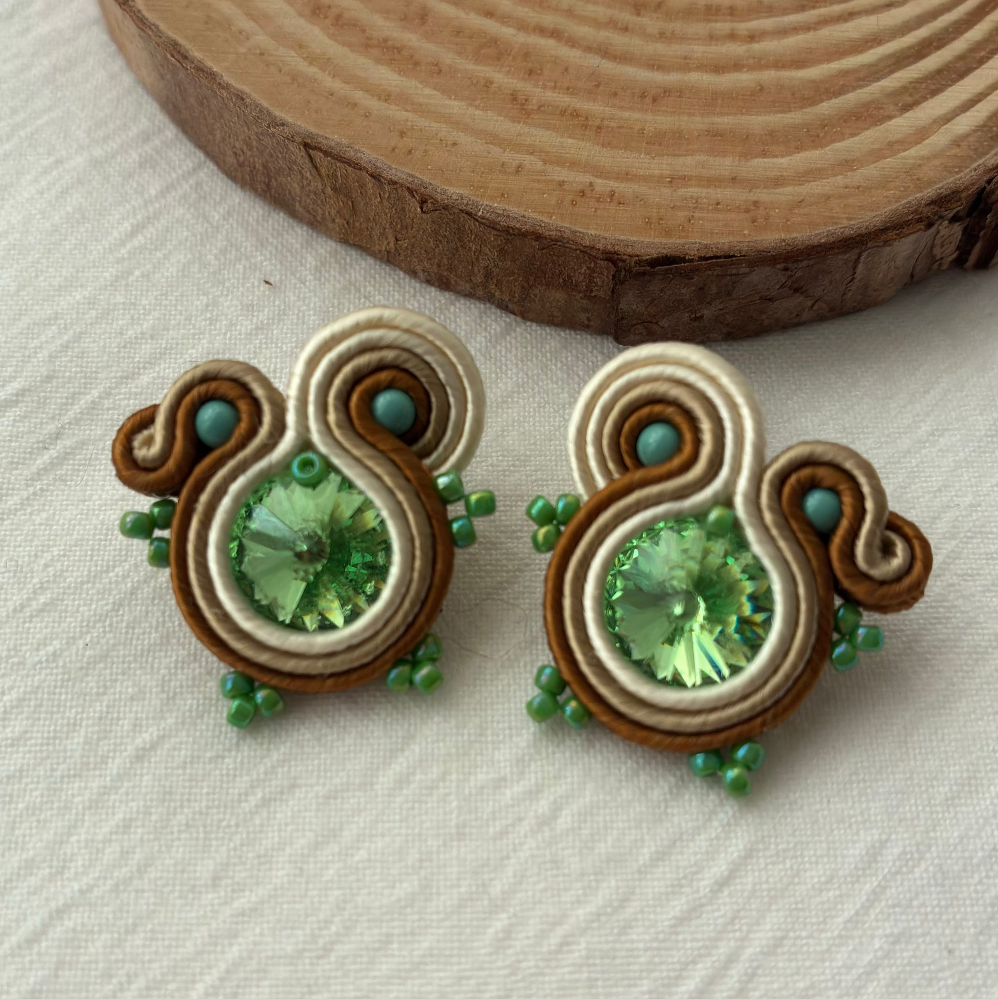 Pendientes Marina con cierre de aro: constan de dos cristales austriacos en talla chatón, de 8mm de diámetro y en color verde peridotita. Los cordones soutache son en tonos tierra. El cierre del pendiente es de tipo aro, de argolla, en acero inoxidable plateado. También tenemos la opción de personalizarlo, solo hay que elegirlo en la lista y nos pondremos en contacto para personalizar solamente los cordones, el cristal seguirá siendo el mismo.