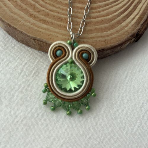 Colgante Marina: consta de un cristal austriaco rivoli, de 12 mm de diámetro en color peridotita. Los cordones son en tonos tierra. Las bolas, tupis y rocallas son en tonos verdes. La cadena es de acero inoxidable plateado y se puede ajustar a la medida que quieras, ya que el mosquetón cabe perfectamente por los eslabones.